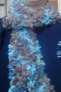 The weather has been a little more chilly where I live lately, which has caused me to bust out some of my warmer attire. I am not much of a coat wearer. I have too many things to hold between babies and bags and the bulk of a coat is just too much. While scouring my drawers I came across a scarf my good friend Kaeli, from Kaeli's Kiwi's, made for me.